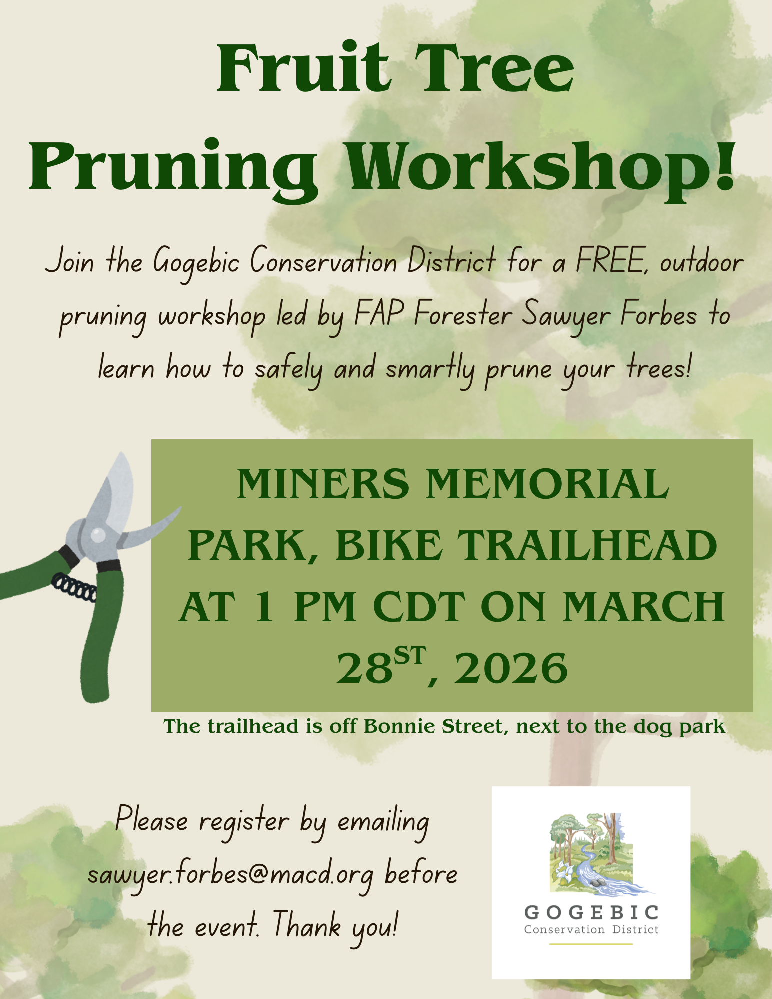 Miners Memorial Heritage Park 775 E Ayer St, IronwoodJoin FAP Forester Sawyer Forbes for a free pruning workshop in Miners Memorial Heritage Park. We will meet at the Bike Trailhead, next to the dog park, at 1 PM CDT on March 28th. The event will be held outdoors and will include information on how to prune trees and shrubs in the springtime, followed […]