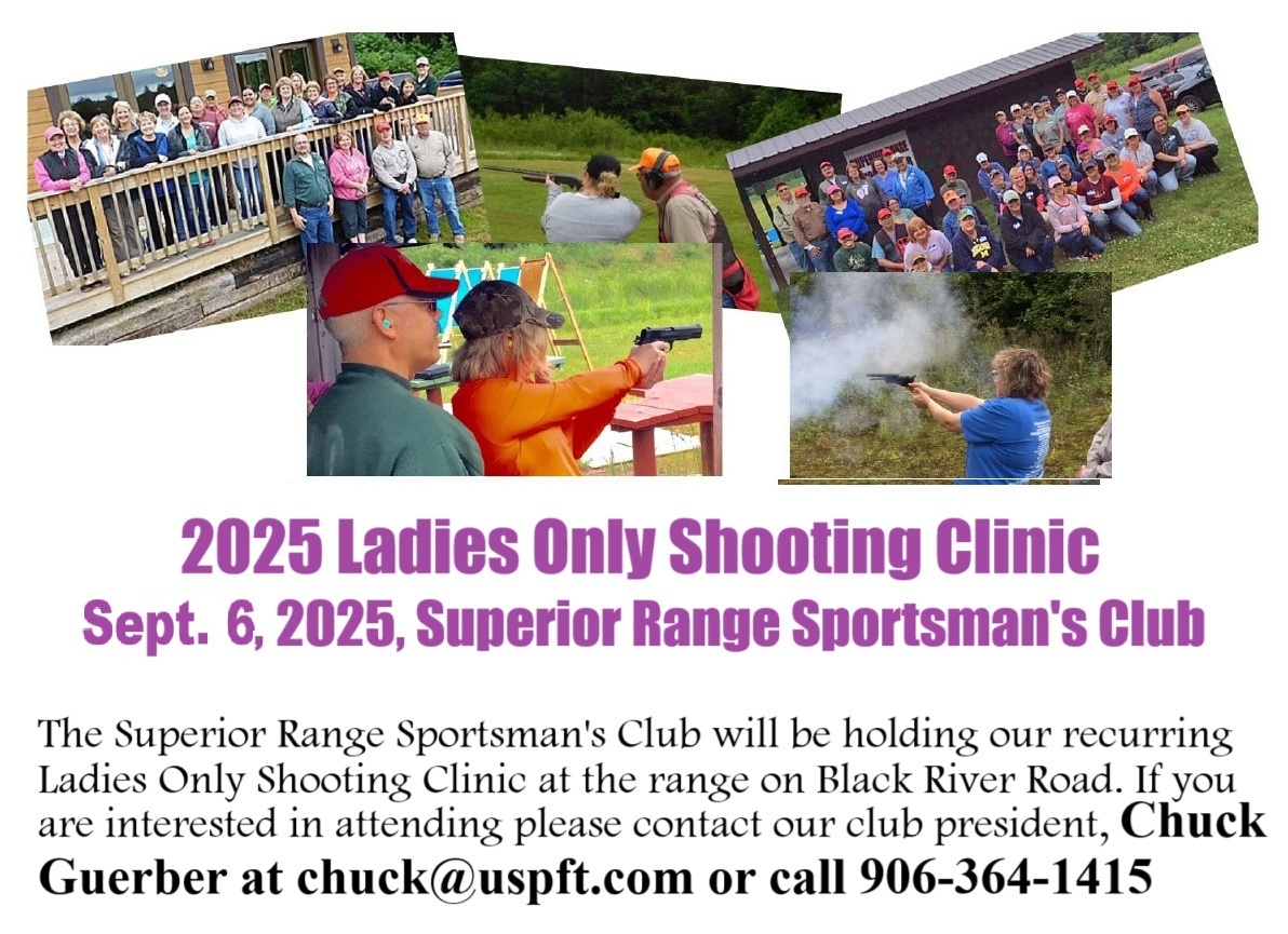 Superior Range Sportsman's Club 13302 Black River Rd., Ironwood, MIThe Superior Range Sportsman’s Club will be hosting another Ladies Only Shooting Clinic, Saturday, September 6, 2025, from 9:00AM to 3:00PM, at their range on Black River Road. Club member and certified firearms instructor Chuck Guerber encourages any woman who wants to learn how to handle and fire a rifle, shotgun, pistol, or black powder […]