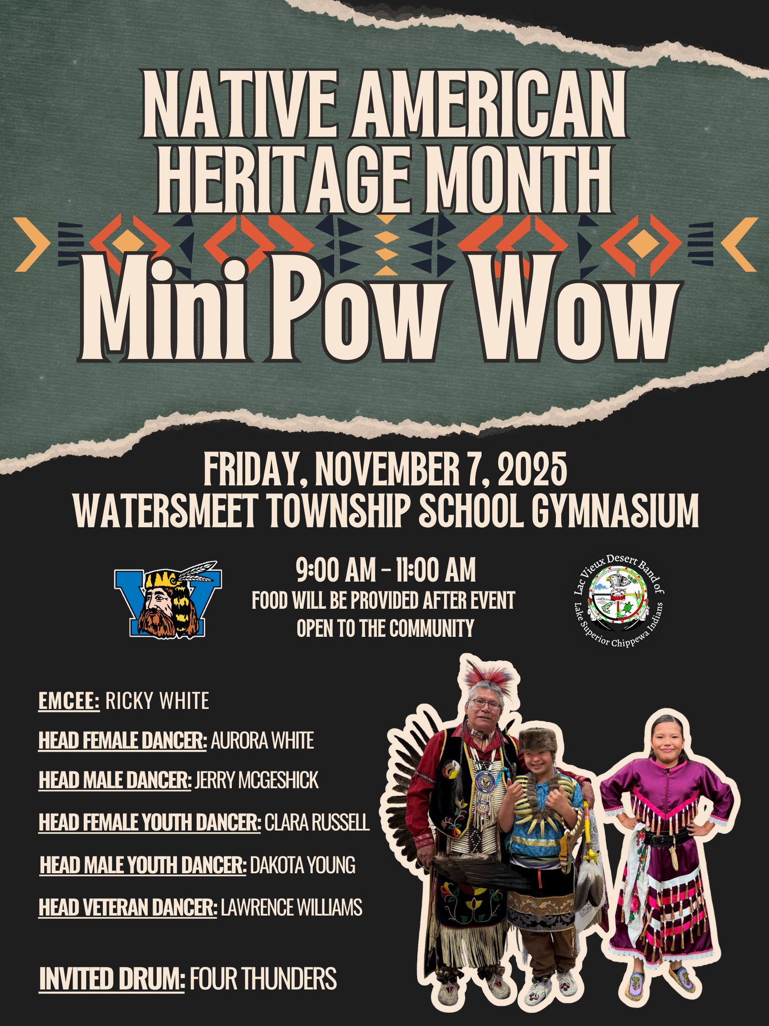Watersmeet Township School N4720 Highway 45, Watersmeet, MIAll are welcome to attend a Mini Pow Wow in celebration of Native American History Month. The event will take place at the Watersmeet Township School Gym on Friday, November 7th, from 9 - 11 AM.